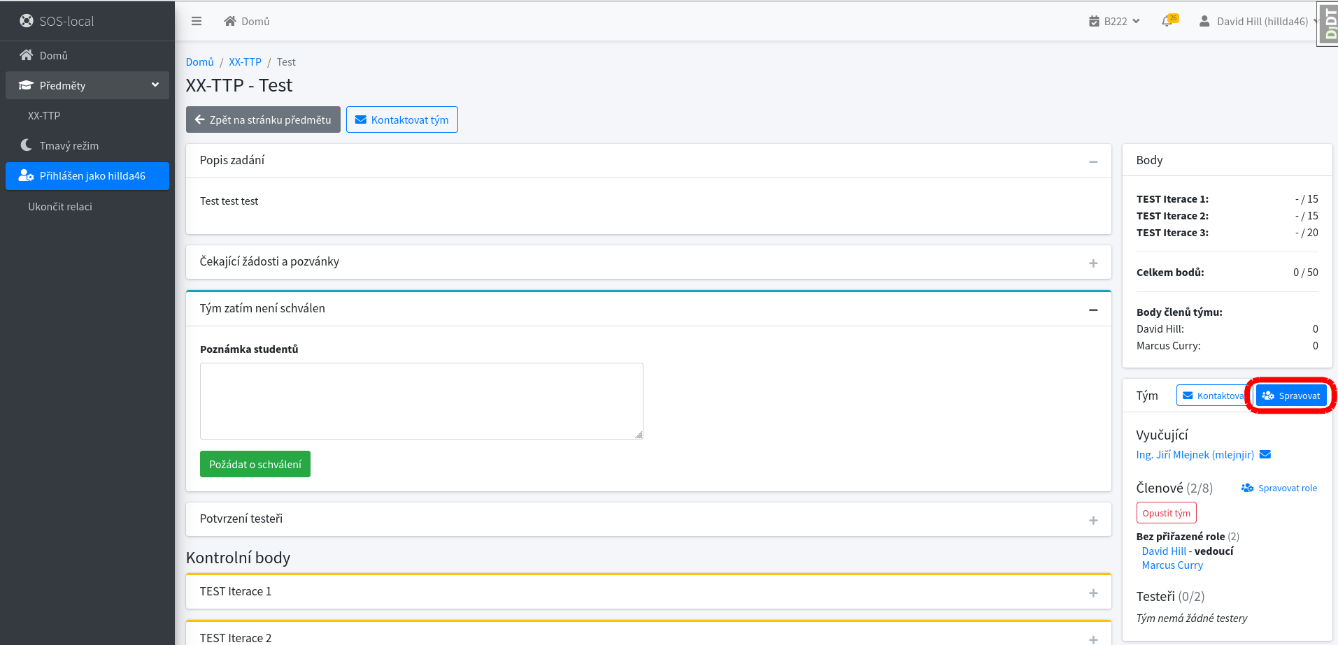 Po schválení týmu bylo oprávnění ho spravovat převedeno na odpovědného vyučujícího. Vaše oprávnění jsou omezena pouze na správu testerů.