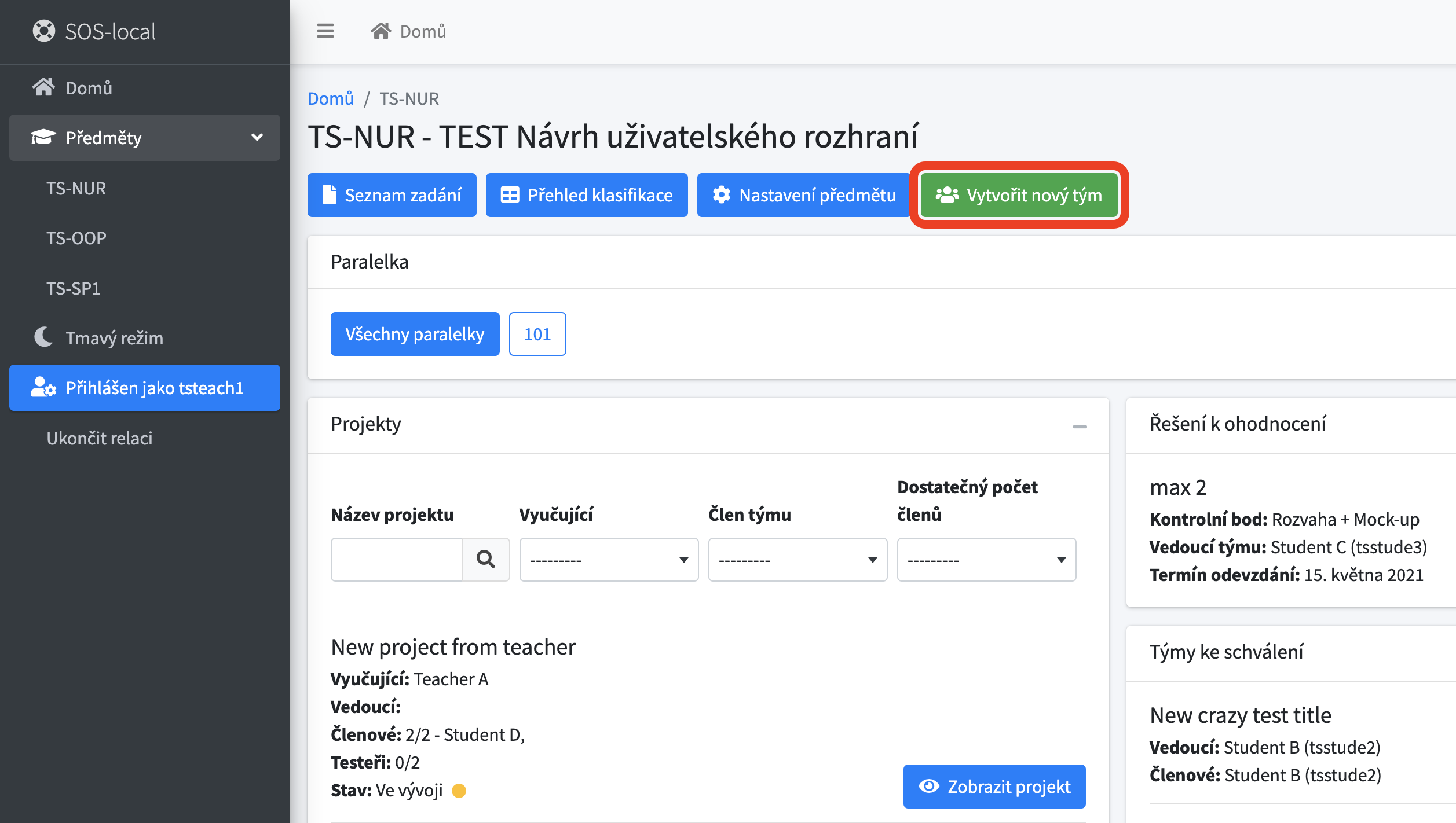 - Na domovské stránce vyberte předmět, ve kterém chcete schválit tým
